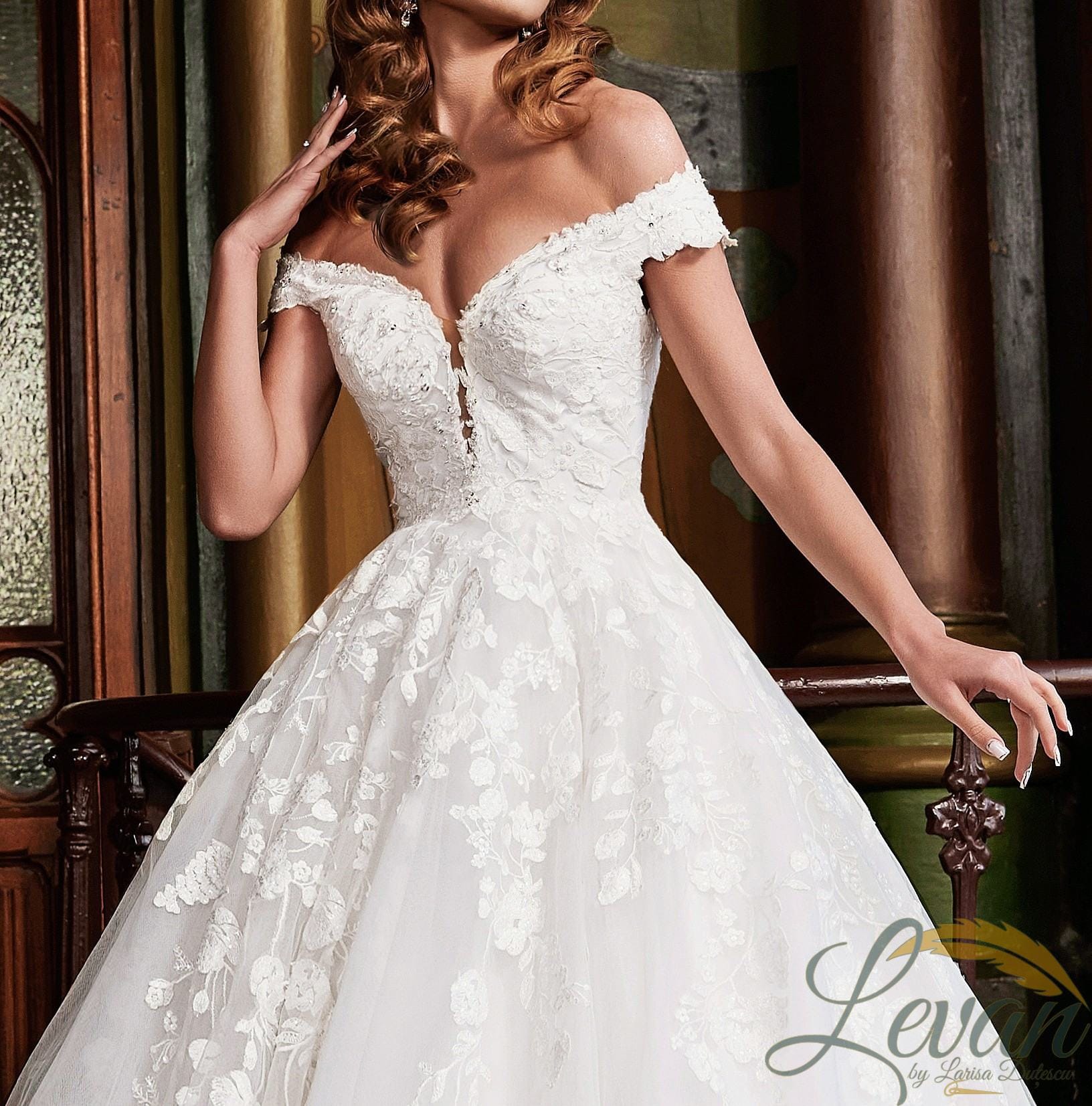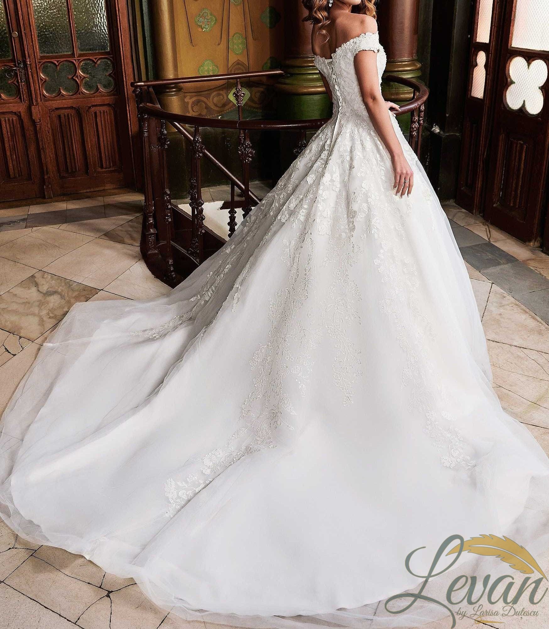 Descriere Modelul “La Isabella” este un omagiu adus tradiției nupțiale pure. Corsetul structurat este acoperit integral de Dantelă Florală care coboară delicat peste linia taliei. Decolteul este caracterizat printr-o tăietură adâncă în V (deep plunge) senzuală dar rafinată, încadrată de bretele căzute (off-shoulder) care lasă umerii goi. Fusta este un nor de Tulle care oferă un volum maiestuos. La spate, închiderea este definită de un șir de nasturi îmbrăcați care coboară pe coloană, acompaniind trena decorată cu aplicații de dantelă.